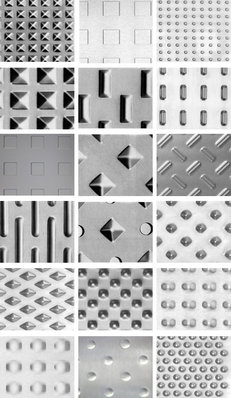 Máme pro vás k dispozici širokou škálu přípravených vzorů vytlačovaných a vroubkovaných plechů pro použití v architektuře. Dále nabízíme možnost výroby nových vytlačovacích nástrojů ke splnění všech specifických požadavků.